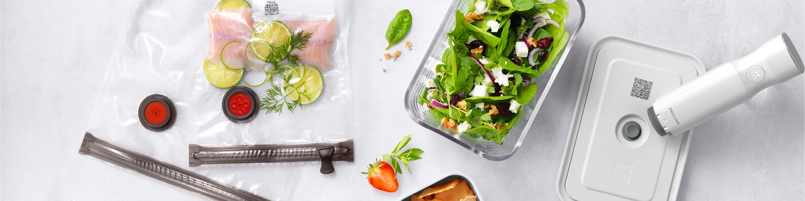 - Containers like our ZWILLING FRESH & SAVE vacuum containers, lunch boxes or vacuum seal bags. They are all the perfect storage choice for your pre-cooked meals.