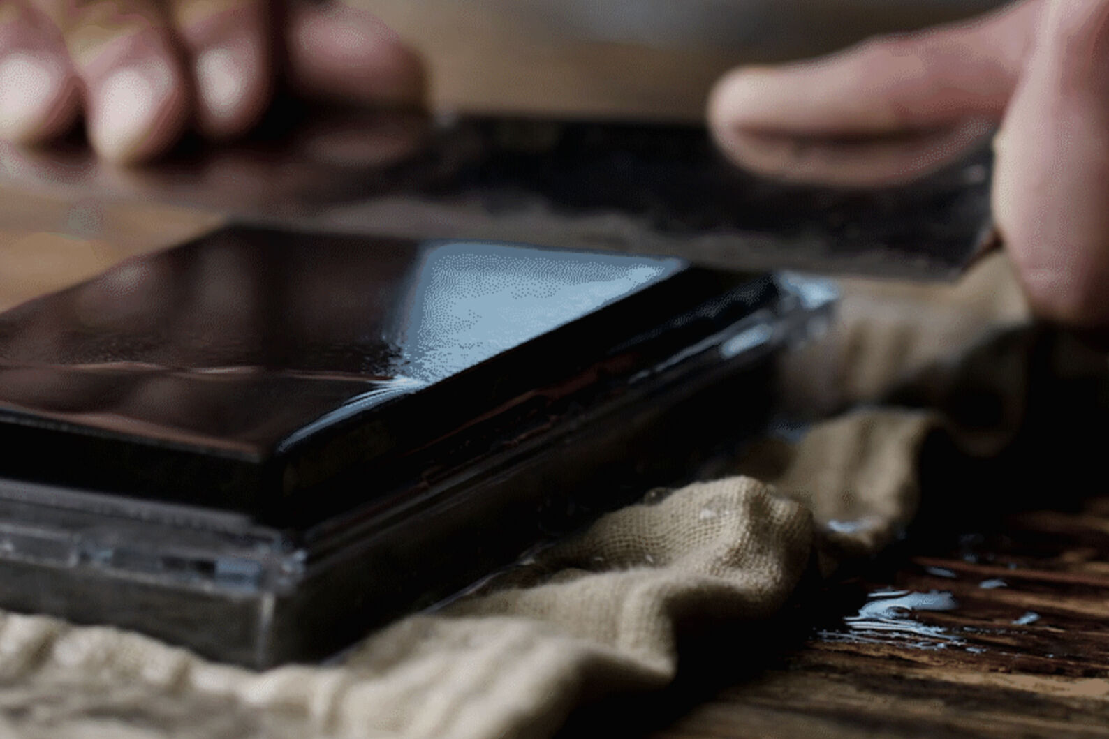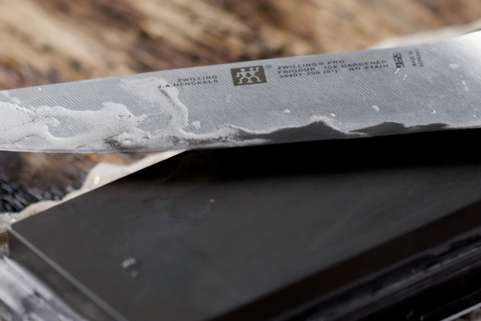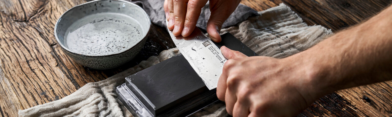 To remove the resulting waste metal from the edge of the knife, draw the knife in a curve from top left to bottom right across the sharpening stone. Then hold the knife under running water to remove all residue and dry it carefully. Store the stone in a cool, dry place – away from direct sunlight.
