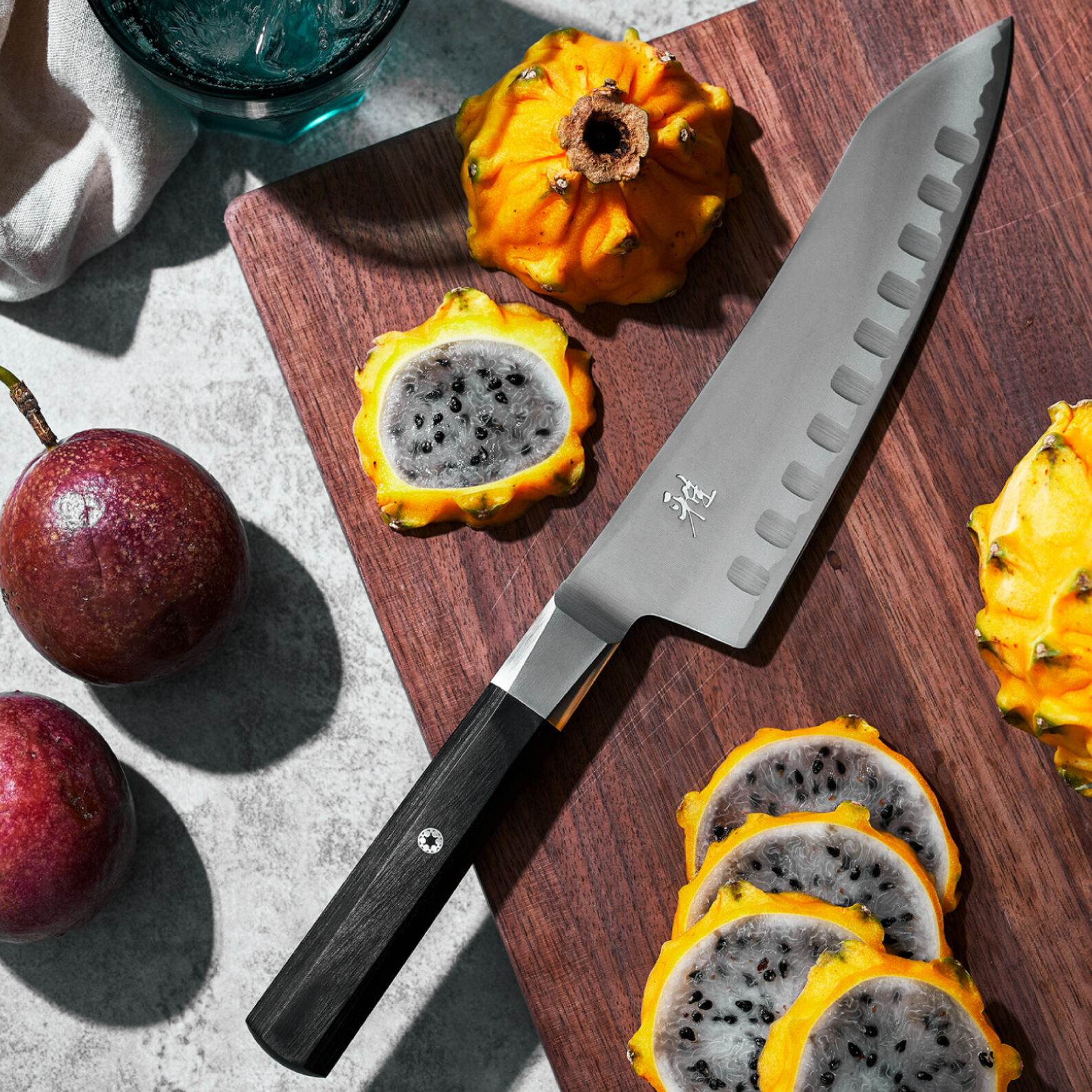First hold the steel point down on a table or cutting board. The angle between the blade and the steel should be approximately 15° for ZWILLING knives. Santoku knives and all MIYABI and Kramer made by ZWILLING knives should be 9-12°.
