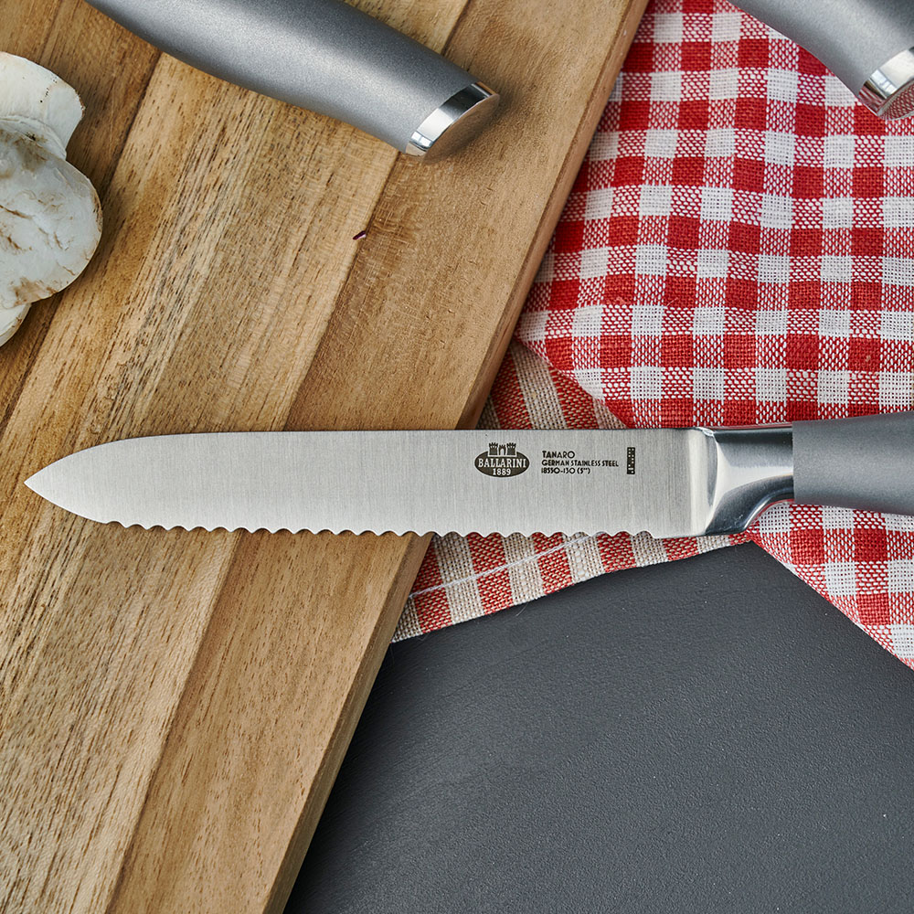 Hard peel, soft core – not a problem for the BALLARINI Tanaro series utility knife. The 13 cm blade cuts bread crusts as cleanly as it does tough vegetable or fruit peel.