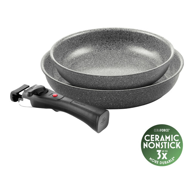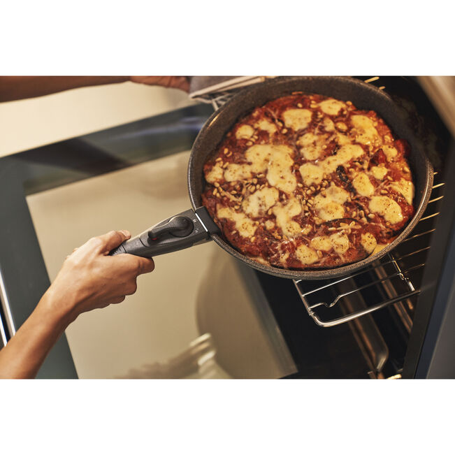 The standout feature is the clever modular design. A single removable handle securely attaches to both the frying pan and saucepan, allowing you to move seamlessly between cooking tasks. Once removed, the cookware can be used in the oven or stacked neatly in cupboards, saving valuable space.