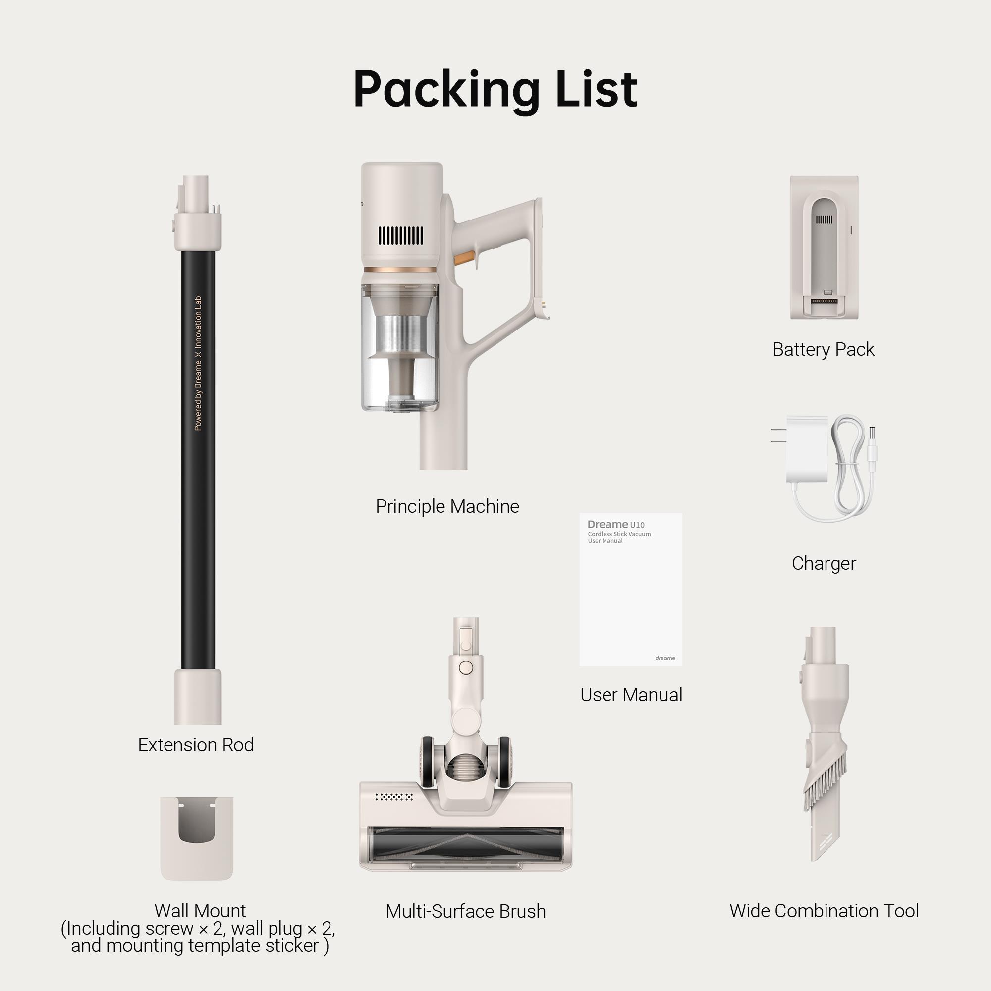 Clean effortlessly with the Dreame U10 Cordless Stick Vacuum. Featuring 100AW suction, a V-shaped multi-surface brush, LED lights for better visibility, and advanced filtration, it delivers powerful, quiet, and convenient cleaning for your home.