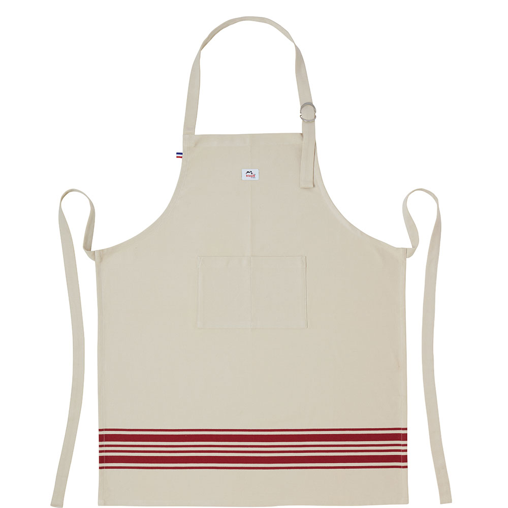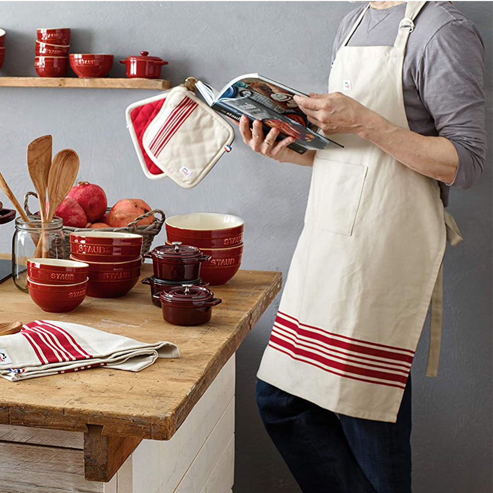 Cooking is fun, but it can get a little messy as well. Protect yourself and your clothes from splashing water, splattering fat or spilled tomato sauce with this practical apron. Also, the act of putting on the apron before starting to cook or bake can be a pleasurable ritual that helps you get in the mood for creating delicious food. The STAUB apron has the classic bib form also known as French chef apron. It is available in one size, measuring 70 x 85 cm and fits most adults due to the adjustable neck strap and the long ribbons that are tied at the back. The large front pocket is divided in two segments for handy storage of cooking utensils or a phone. Made of 100 % cotton, the apron can be washed in the machine and is very durable. Its timeless design includes dark red stripes on an off-white background, making it a harmonious match for a country style kitchen as well as a modern restaurant. A small label in red, white and blue stripes is a reminder of STAUB’s French heritage.