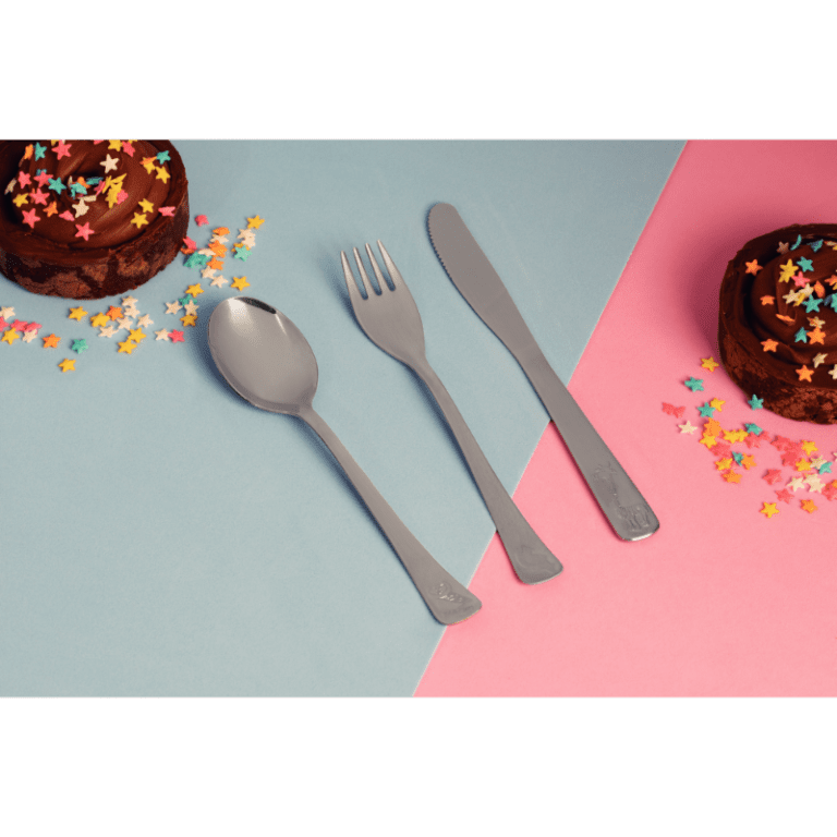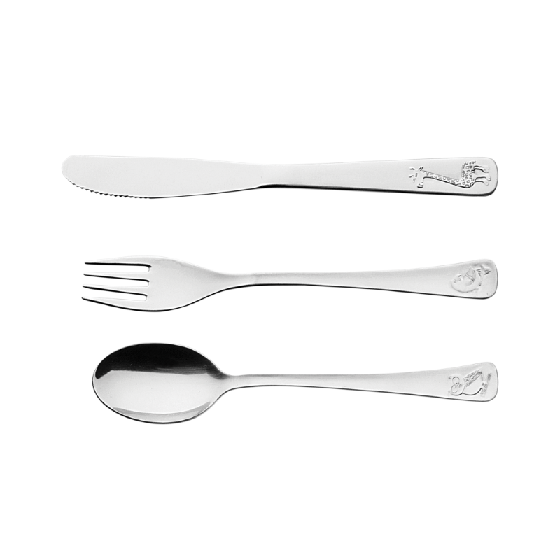 3-piece stainless steel child’s cutlery set with ergonomic design and embossed details. Safe, hygienic, and dishwasher safe.