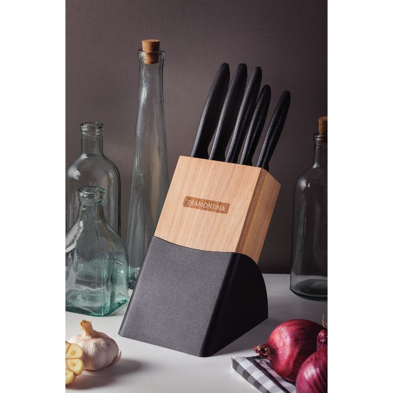Impress your guests with the Tramontina Plenus 6-piece knife set, featuring stainless steel blades and sturdy black polypropylene handles. This set includes versatile knives suitable for a wide range of kitchen tasks. The knives are dishwasher safe for easy cleaning, and the wooden block adds a stylish touch to your countertop. Perfect for both simple and complex food preparation, this set is a must-have for your kitchen.