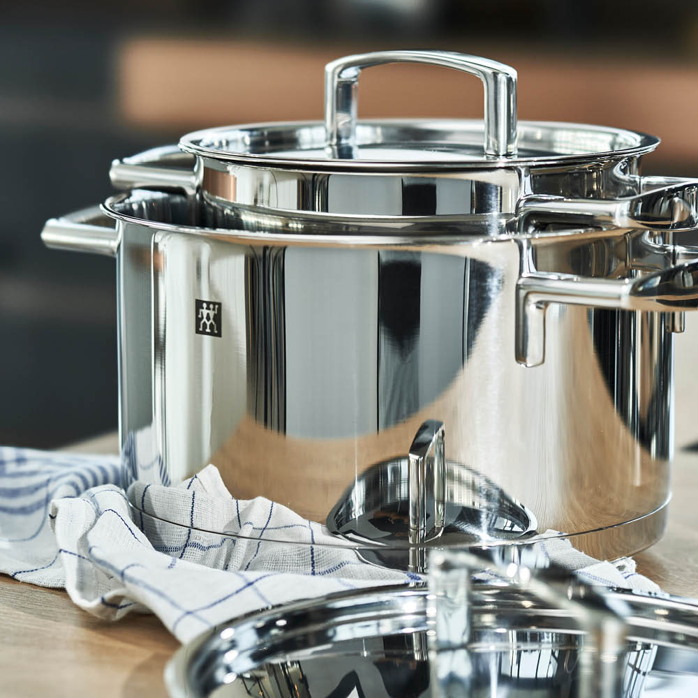 Always have the right pot at hand with a large stew pot, three pots in different sizes – all with a matching, snug-fitting lid – and a handy saucepan for sauces, milk or something else. Particularly practical is the integrated filling scale for measuring liquids. Ergonomically designed cast stainless steel handles simplify handling and remain cool even when the pot’s contents are simmering, thanks to the integrated stay-cool feature. The different pots can be used on gas, electric and, of course, induction hobs, and they save energy thanks to their special base. Incidentally, because they’re made with stainless steel, they can even be used in the oven.