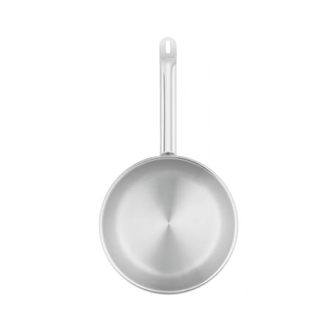 The deep walls (≈ 8.9 cm) make it ideal for deeper dishes and reduce splatter, while the wide, drip-free rim ensures clean pouring of sauces without mess.  The sturdy stainless steel handle stays cooler longer and offers a secure grip for safe handling.