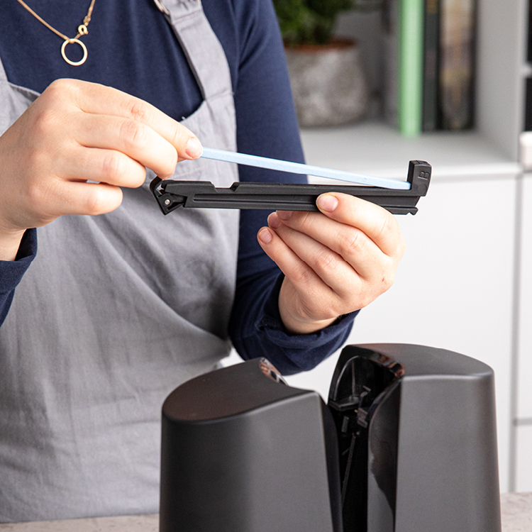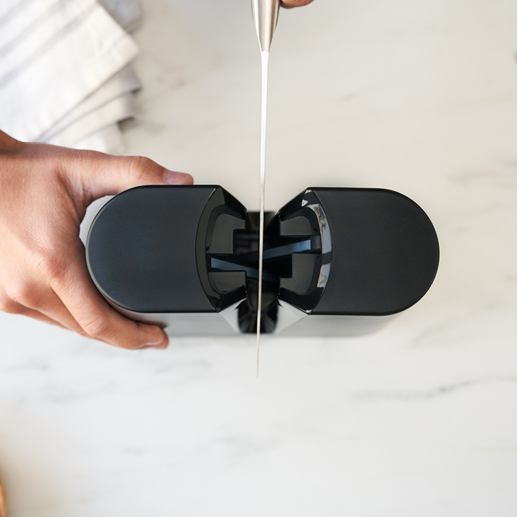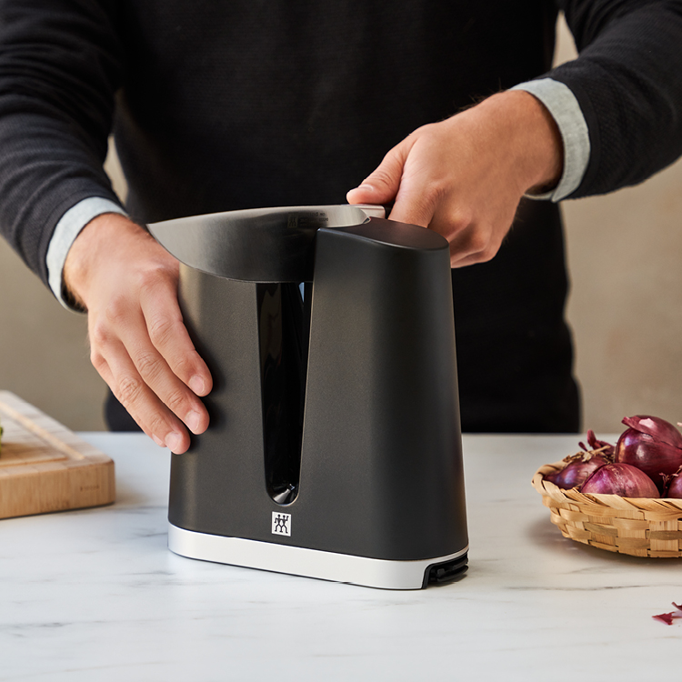 The ZWILLING V-Edge knife sharpener makes it easy to finely sharpen blades. Simply insert the knife and pull it through several times to evenly grind the entire blade. This is fast and safe for both blades and hands alike.