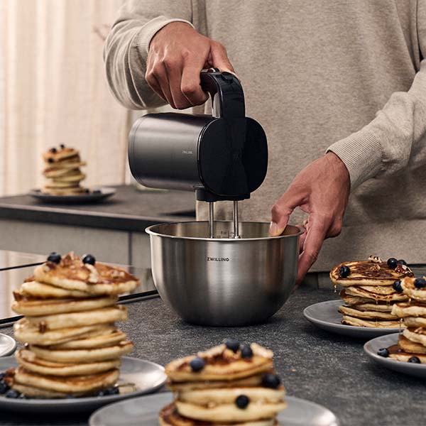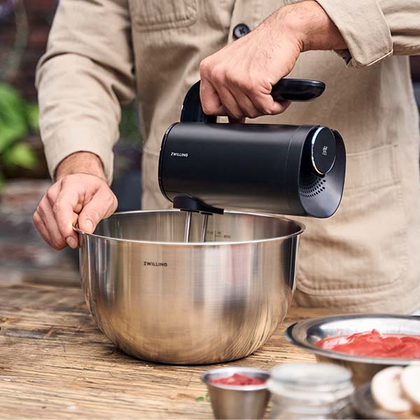 Everything is in the mix: power, versatility and timeless design – and no cords. The battery-powered ZWILLING XTEND Cordless Hand Mixer provides complete freedom in the kitchen while delivering the same performance as a corded mixer. Equipped with dough hooks, whisks, and three speed settings, it offers maximum versatility for mixing batter, kneading dough, whipping egg whites, and creating fluffy cream.